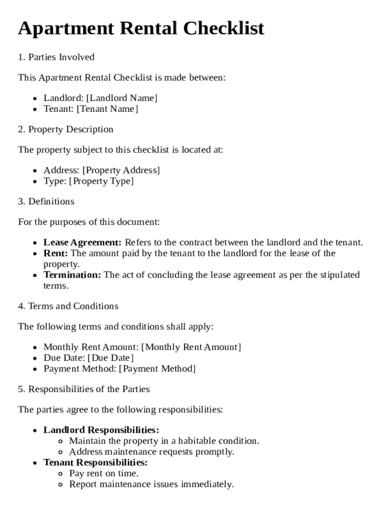 An apartment rental checklist serves as a comprehensive guide for both landlords and tenants. It helps define clear expectations, responsibilities, and ensures mutual understanding before signing a lease. Using a digital template is advantageous as it allows easy modifications and access from anywhere.