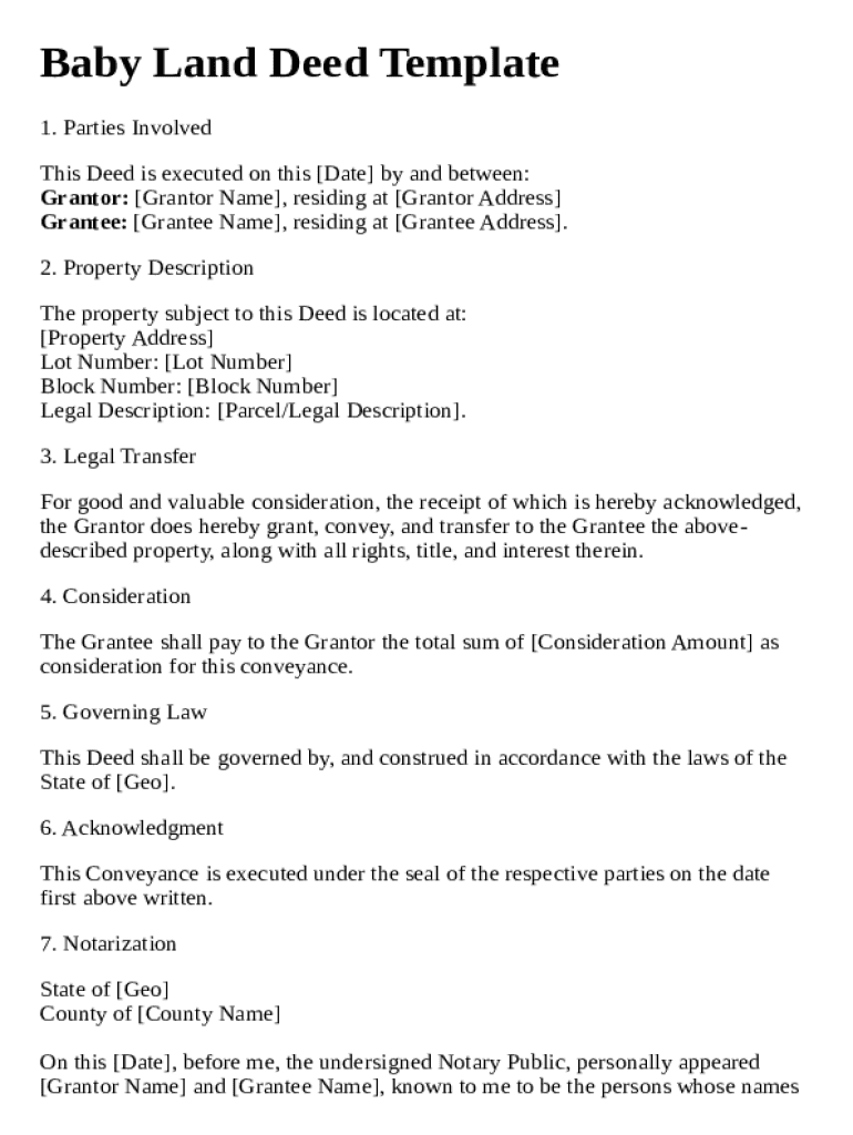 Notarization is a critical step in confirming the validity of a baby land deed. This process involves a certified notary public who verifies the identities of the signing parties. Different states may have specific notarization requirements, such as being present during signing or needing additional documentation.