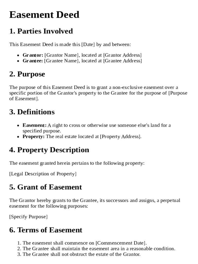 The structural breakdown of an easement deed ensures that all critical information is documented appropriately. It serves as a template for constructing legally valid documents.