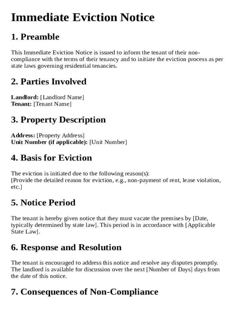 An immediate eviction notice template is a legal document used by landlords to inform tenants that they must vacate the property without delay.