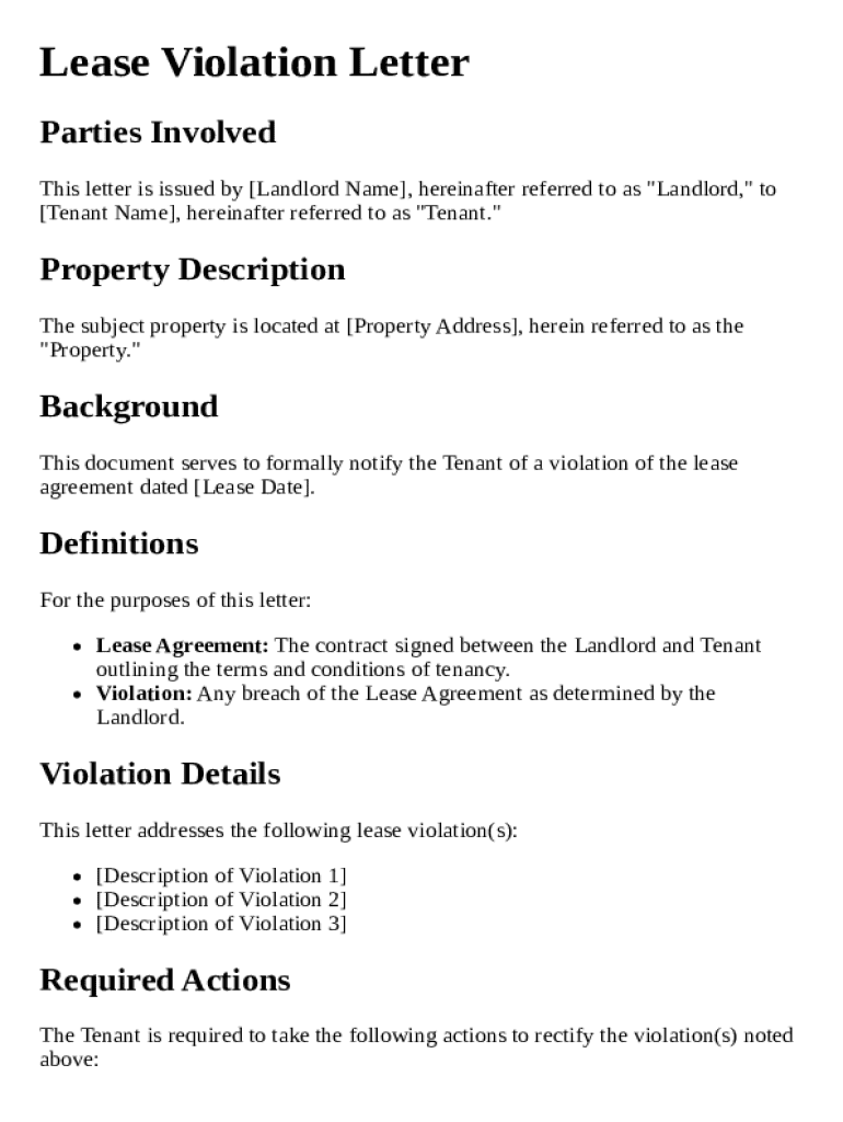 A lease violation letter template is a formal document used to notify a tenant of their breach of lease terms and outline potential consequences.