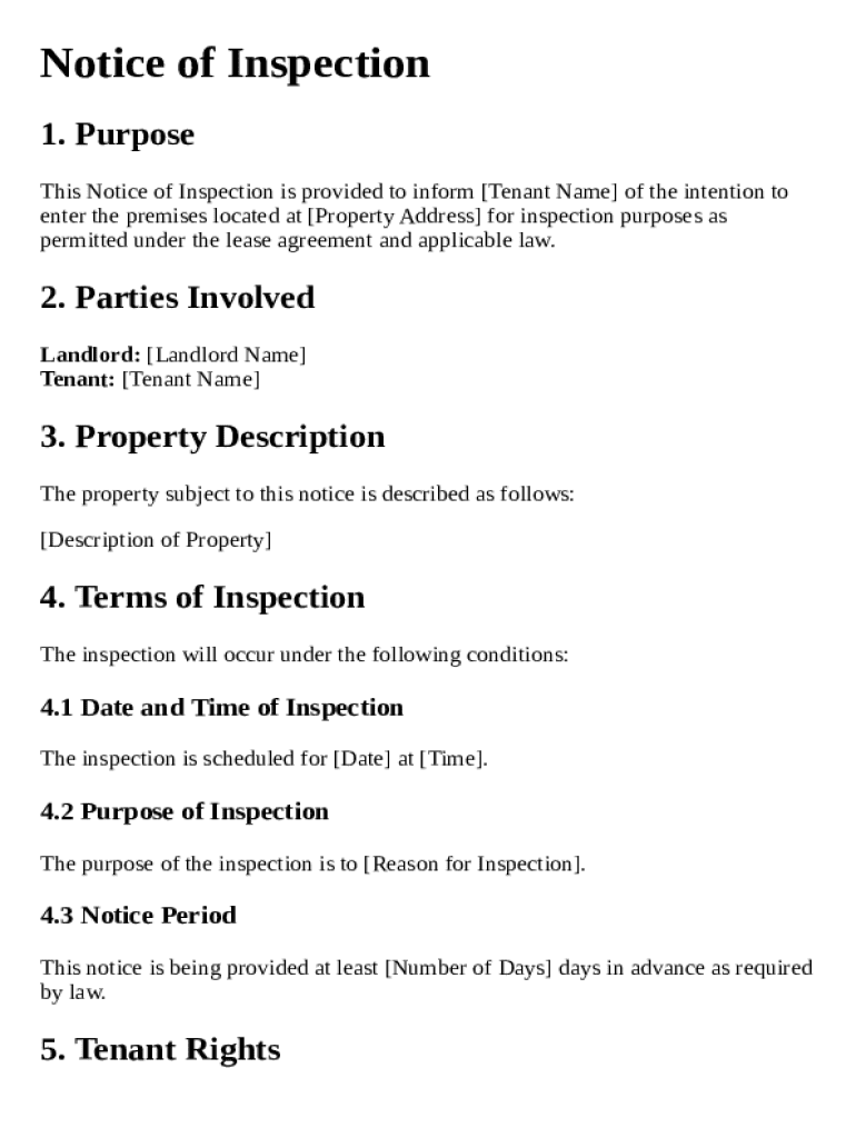 A notice of inspection template is a formal document used to inform parties about an upcoming inspection of a property or facility.