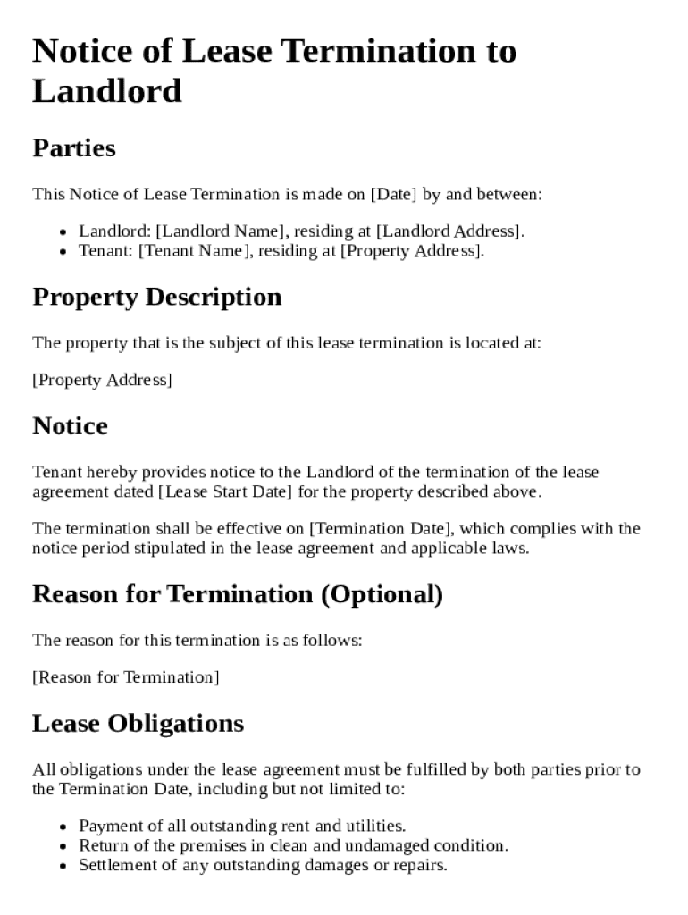 A notice of lease termination is a formal document informing a tenant or landlord that a lease agreement will be ending on a specified date.