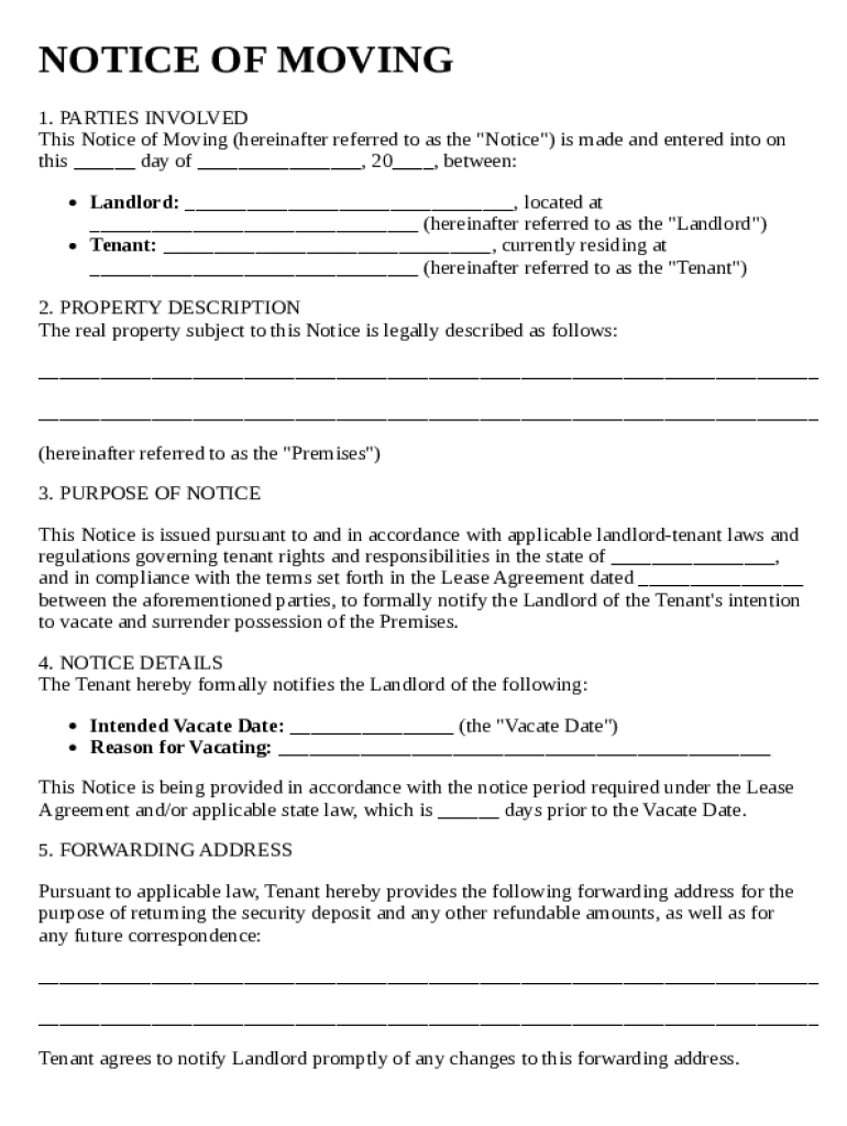 A notice of moving template is a formal document used to inform relevant parties about an individual's upcoming relocation.