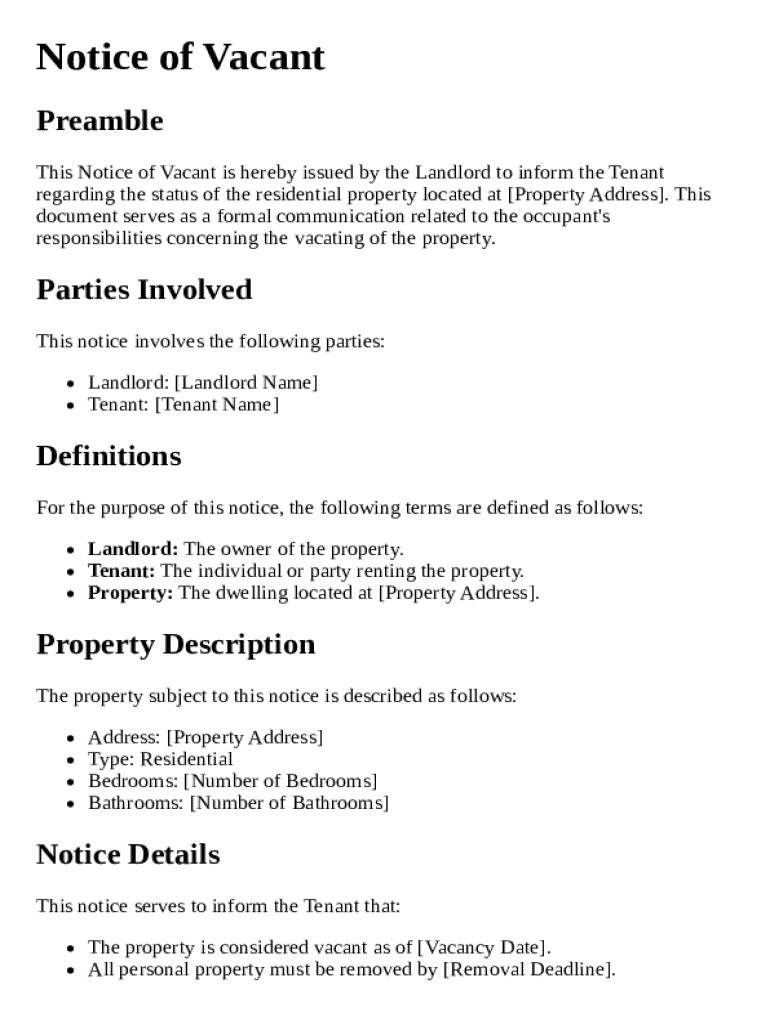 A notice of vacant template is a formal document used to inform tenants or property management about a rental property that is currently unoccupied.