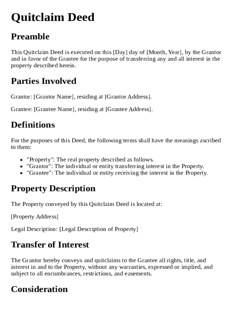 A quitclaim deed template is a legal document used to transfer interests in real property without guaranteeing the property title.