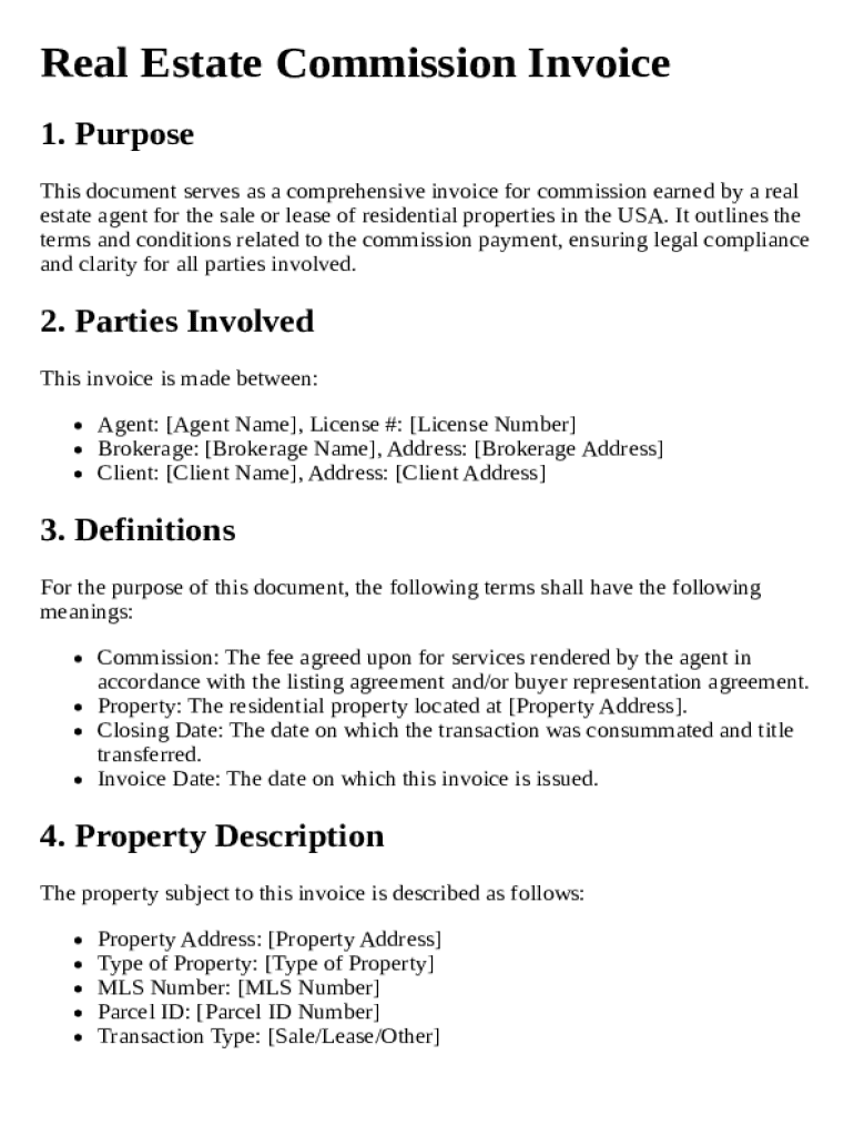 Este documento sirve como una factura integral por la comisin ganada por un agente de bienes races por la venta o alquiler de propiedades residenciales en los EE. UU. Establece los trminos y condiciones