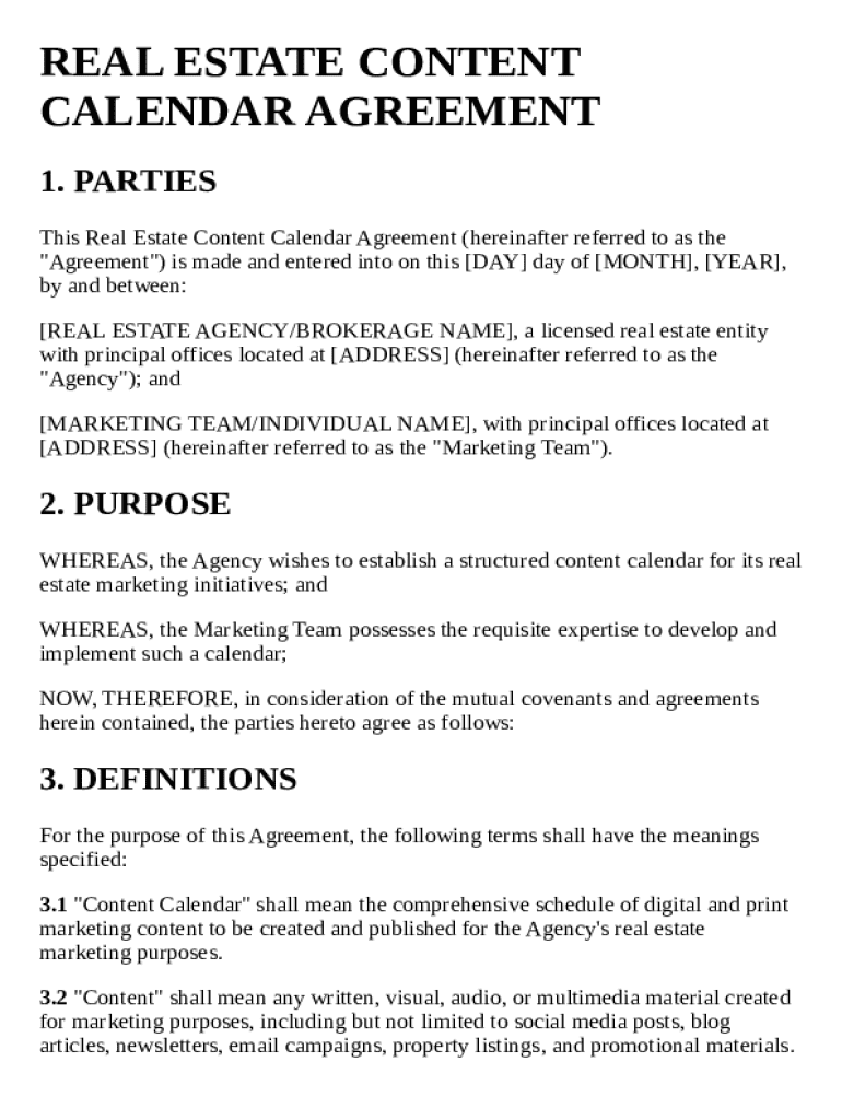 This document outlines the agreement between a real estate agency and a marketing team for the development and implementation of a content calendar for real estate marketing initiatives.