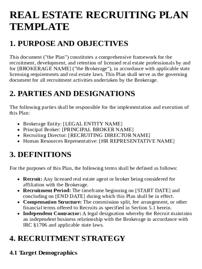 This document provides a framework for recruiting, developing, and retaining licensed real estate professionals within a brokerage, outlining strategies, definitions, and compliance requirements.