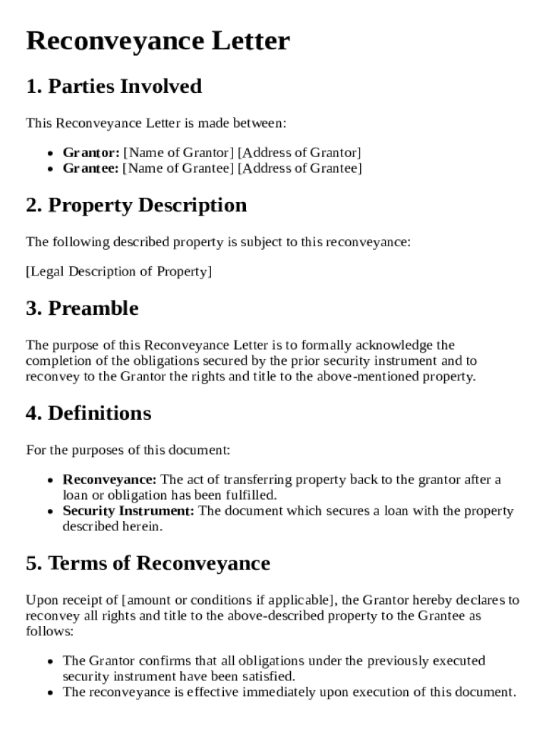 The preamble of your reconveyance letter sets the stage for the document, summarizing the key elements and intentions.