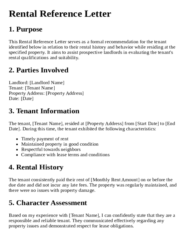 A rental reference letter template is a pre-formatted document used to provide a prospective landlord with a reference about a tenant's rental history and reliability.