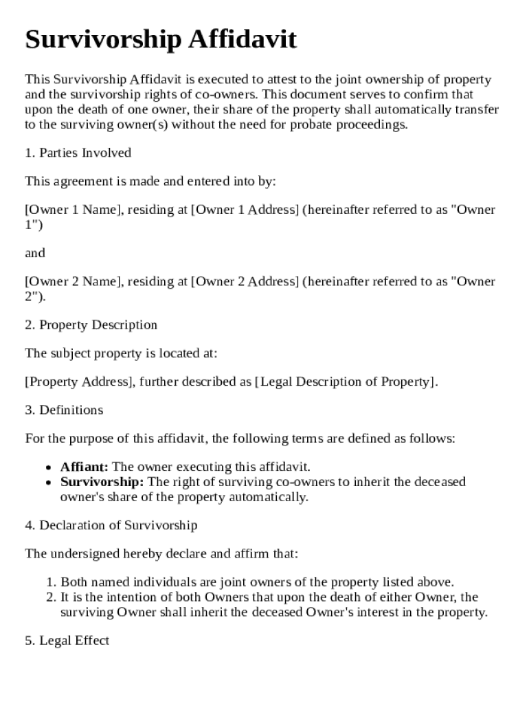 A survivorship affidavit template is a legal document that certifies the status of property ownership upon the death of one joint tenant.