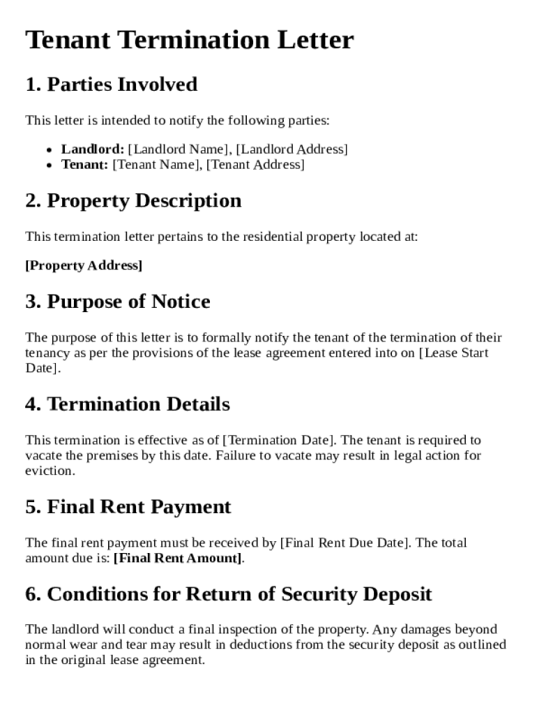 A tenant termination letter is a formal notice that indicates an intention to terminate a rental agreement. It is crucial for documenting the end of tenancy and ensuring all parties are informed. There are distinct differences between termination letters for landlords and tenants, particularly in the legal language and obligations required.