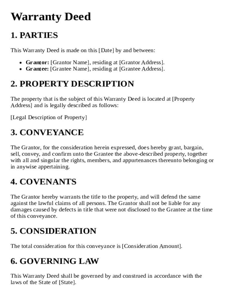 A typical warranty deed structure includes sections for grantor, grantee, property description, and terms of the warranty.