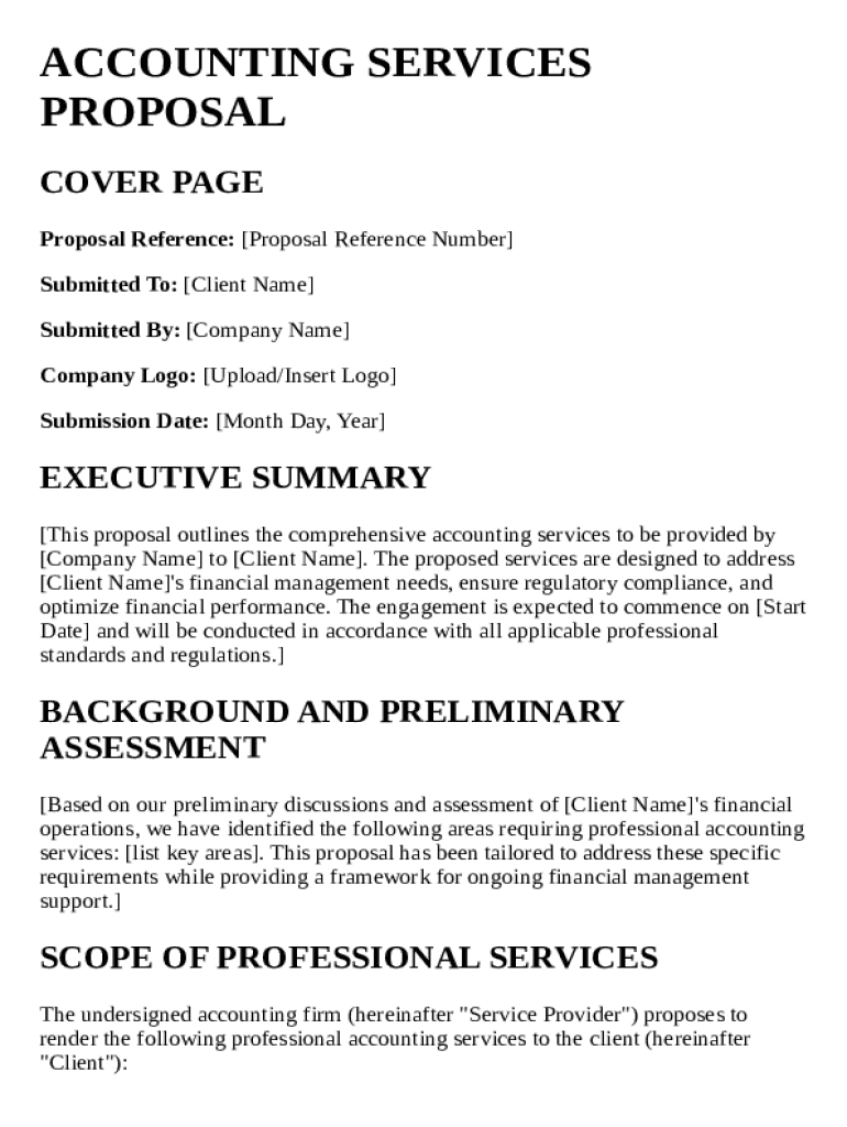 An accounting services proposal template is a structured document that outlines the terms, services, and costs associated with accounting services offered to clients.