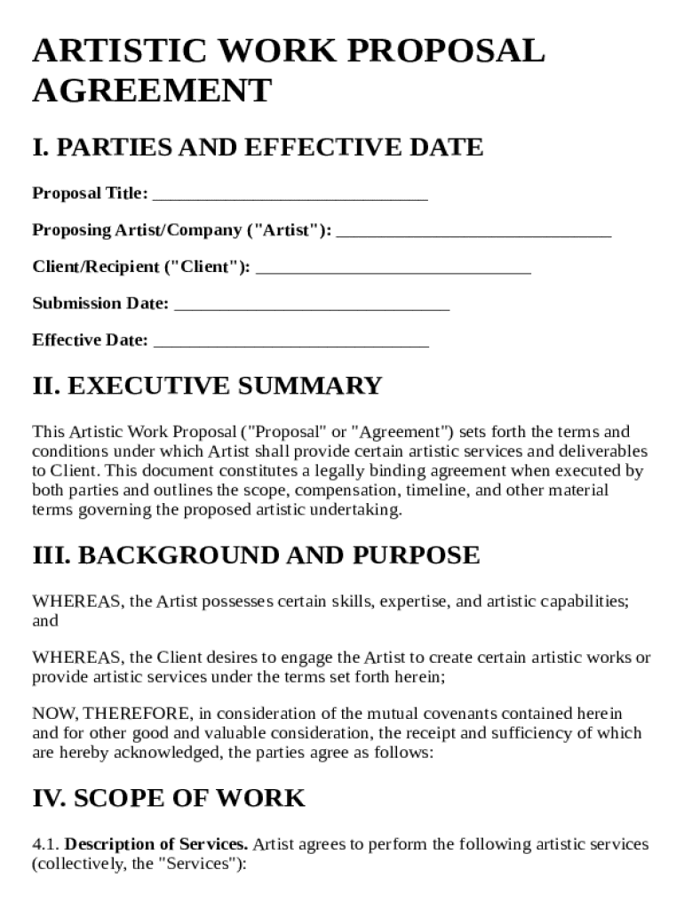 Filling out an art proposal template form can significantly enhance your chances of securing projects. This guide will walk you through each component of the art proposal agreement, providing you with everything you need to make a professional impression.
