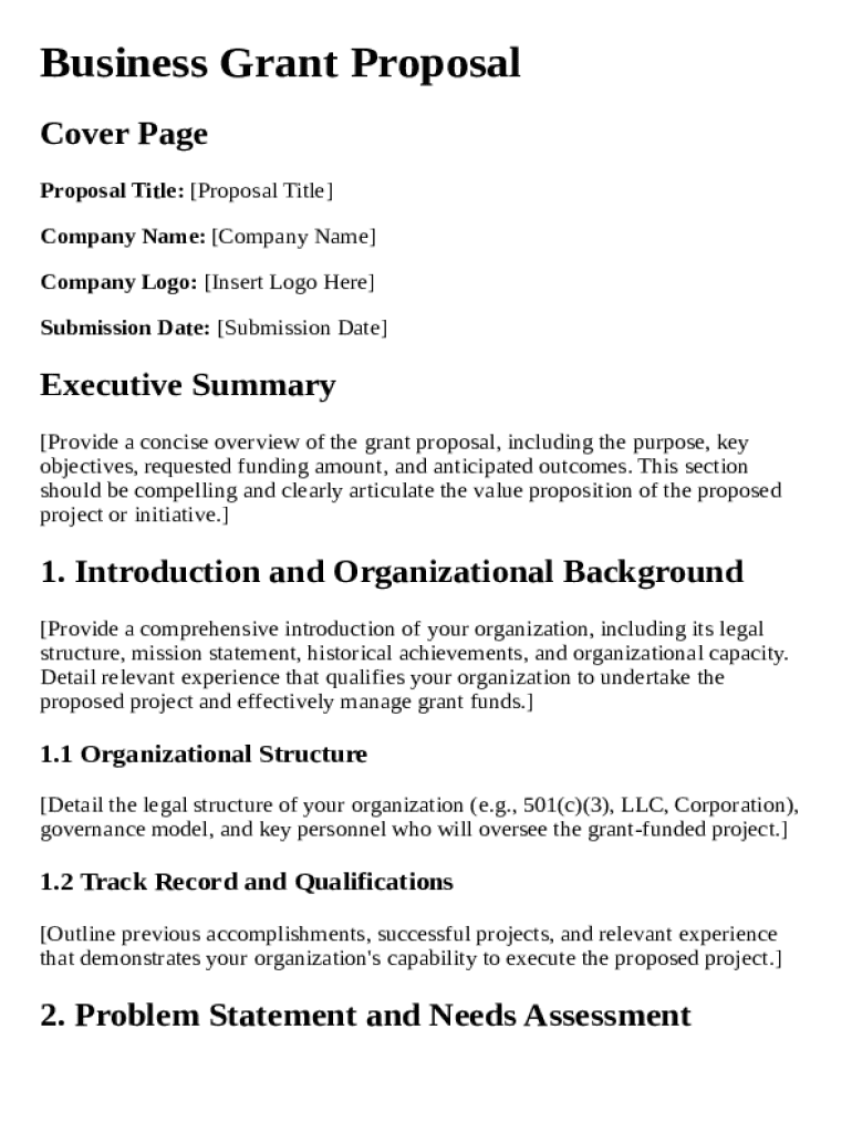 This document is a comprehensive business grant proposal aimed at securing funding for a proposed project. It includes sections such as an executive summary, organizational background, problem statement,