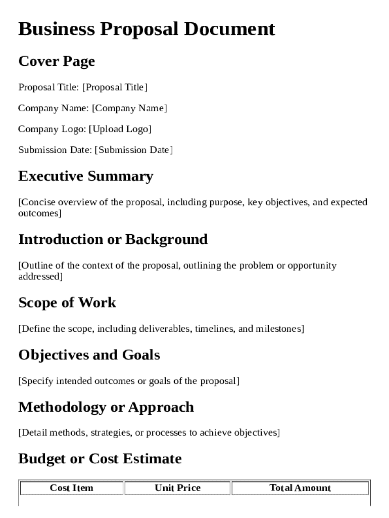 A structured document outlining a business proposal including objectives, methodology, and budget estimates.