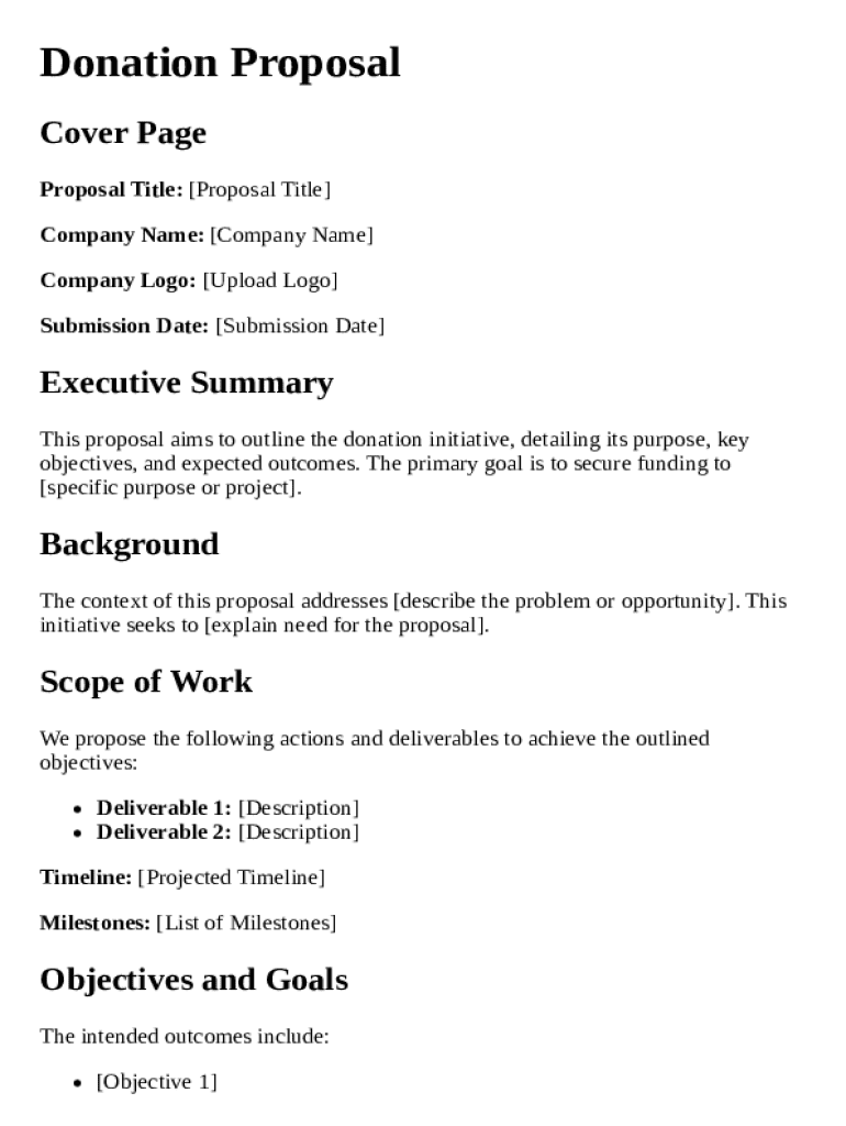 A donation proposal is a vital document that outlines the requirements for financial support from potential donors. It aims to persuade them of the importance and potential impact of your project or cause. Key components of a successful proposal include a clear presentation of the problem, objectives, scope of work, and budget.