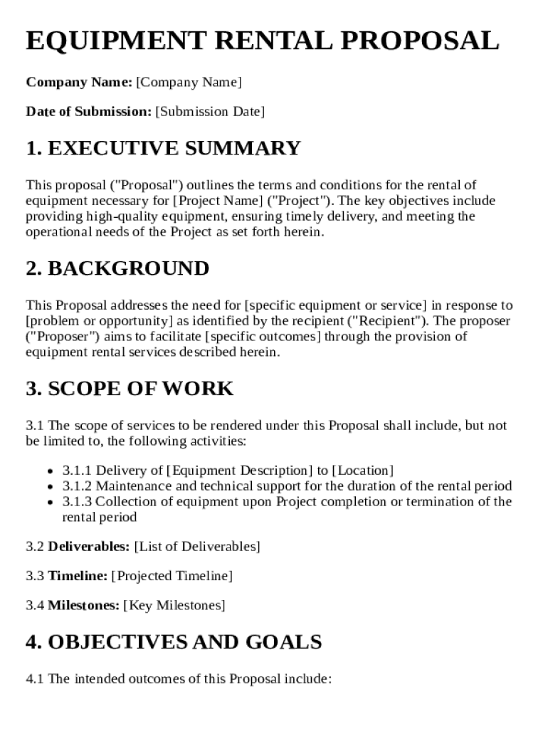 This proposal outlines the terms and conditions for the rental of equipment necessary for a specified project, including objectives, scope of work, budget, and terms of agreement.