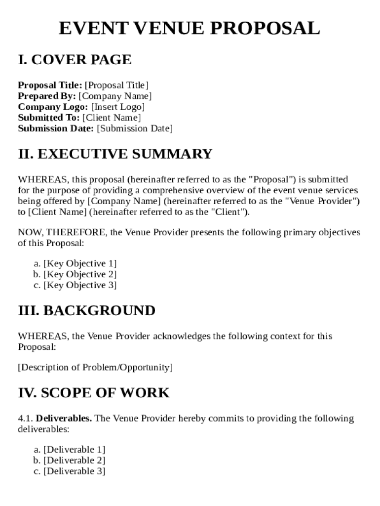 This document serves as a comprehensive overview of the event venue services offered by the Venue Provider to the Client, outlining objectives, deliverables, budget, and terms.