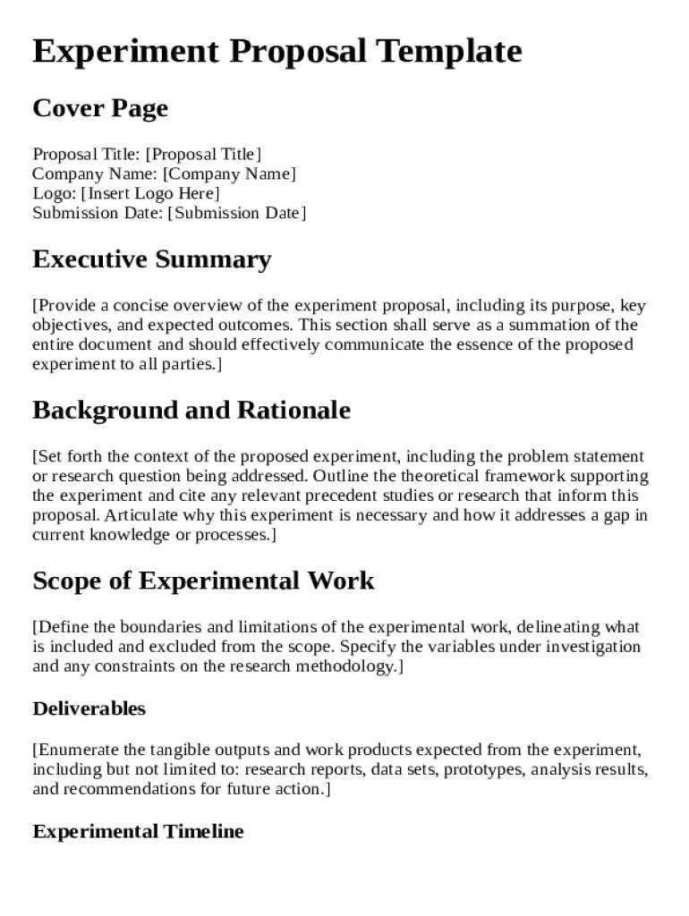 This template provides a structured format for proposing an experiment, outlining the objectives, methodologies, deliverables, budget, and ethical considerations necessary for conducting scientific