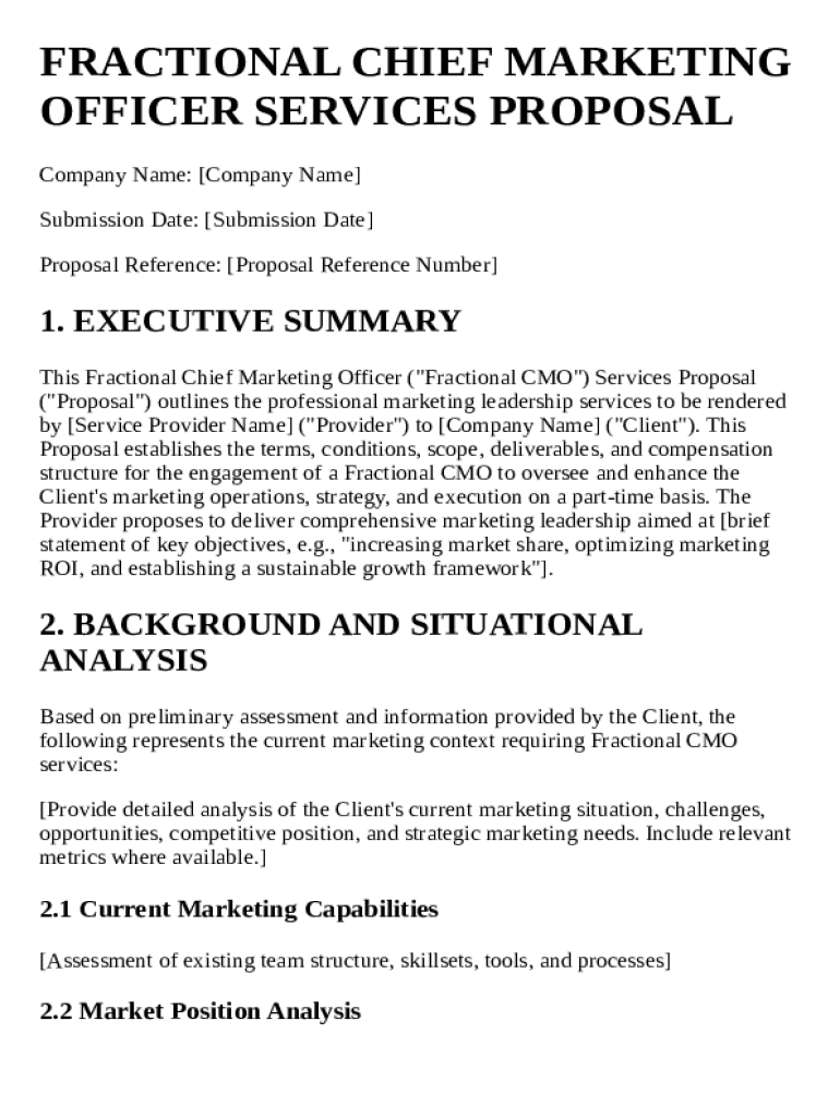 Filling out a fractional CMO proposal template form involves understanding the specific needs of your marketing strategy and clearly articulating how a fractional Chief Marketing Officer (CMO) can meet those needs. This guide will walk you through the essential components and best practices for creating a comprehensive proposal.