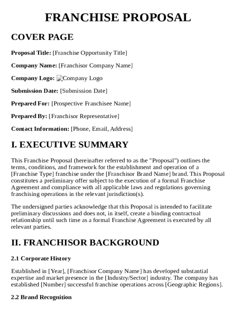 The cover page of your franchise proposal is the first impression that a potential franchisee will have. A well-structured cover page should contain the title of the proposal, your business's name, contact details, and a logo. The design should be professional and visually appealing to establish an immediate sense of credibility.