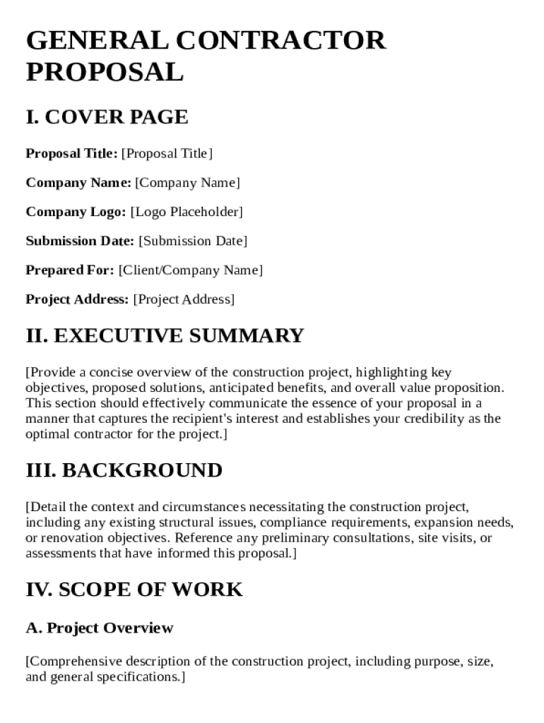 Using a General Contractor Proposal Template offers several advantages including clarity, consistency, and professionalism in your proposals. It streamlines the process of proposal creation, allowing you to save time on repetitive tasks and focus on more critical aspects of project management. A well-defined General Contractor Proposal Template also reduces misunderstandings with clients, as it clearly outlines expectations and deliverables.
