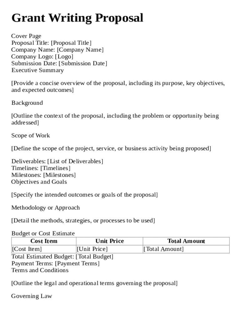 This document serves as a template for a grant writing proposal, outlining necessary sections such as the executive summary, background, scope of work, objectives, budget, and terms and conditions.
