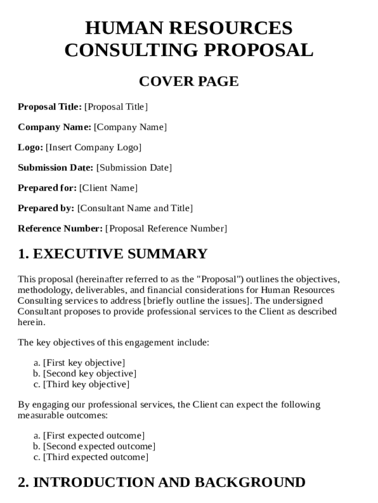 A human resources consulting proposal is a formal document outlining the services a consultant will provide to address HR-related issues within an organization.