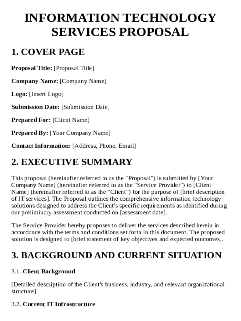 An IT services proposal template form is a structured document designed to outline the offerings and terms of IT services provided to clients. The purpose of this template is to ensure clear communication of the service delivery process, set expectations, and formalize agreements. By utilizing a uniform template, organizations can streamline their proposal creation process while enhancing professionalism.