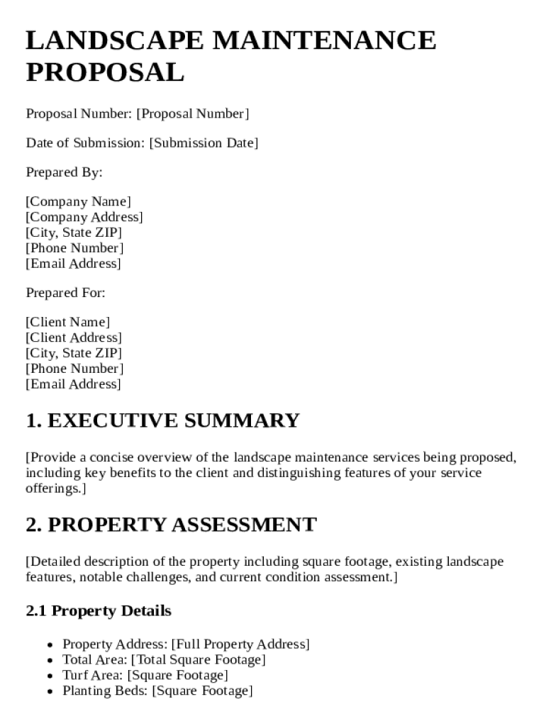 This document outlines the proposal for landscape maintenance services, including detailed descriptions of services offered, property assessments, maintenance schedules, compensation details, and