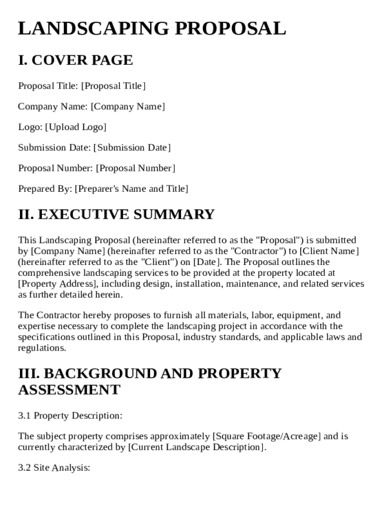 A Landscaping Proposal Template is a structured document used by landscaping professionals to outline the services they offer, pricing, and project timelines. This template is essential for presenting a clear and professional proposal to clients, helping to ensure that all aspects of the project are understood and agreed upon in advance. By utilizing a Landscaping Proposal Template, you can enhance your credibility and streamline the proposal process.