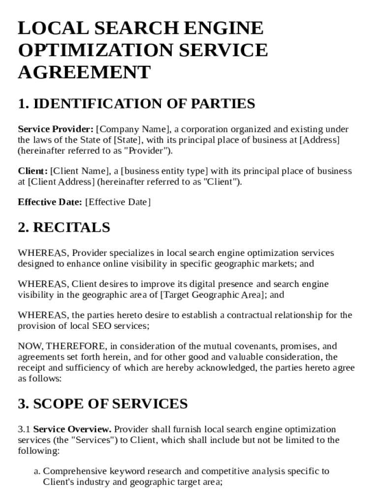 This document outlines the agreement between a service provider and a client for local search engine optimization services aimed at enhancing the client\'s online visibility in specific geographic