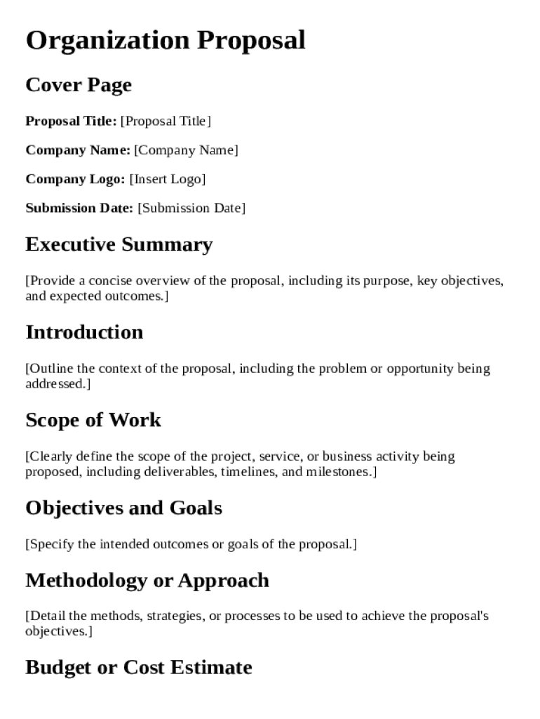 An organization proposal is a formal document detailing your project objectives, the methods to achieve them, a budget, and timelines.