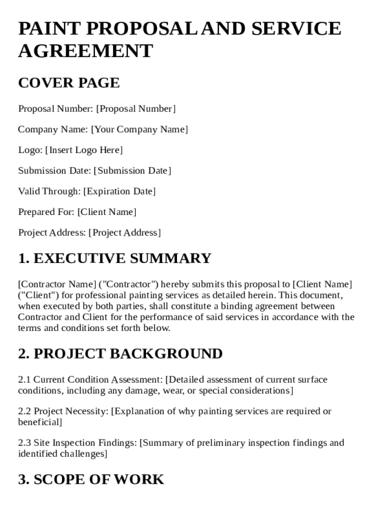 A standard painting proposal includes an introduction, project background, scope of work, pricing, and terms.