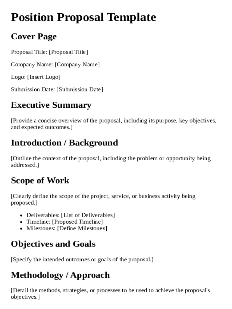 A position proposal template outlines the key elements required in job proposal submissions, ensuring clarity and uniformity.