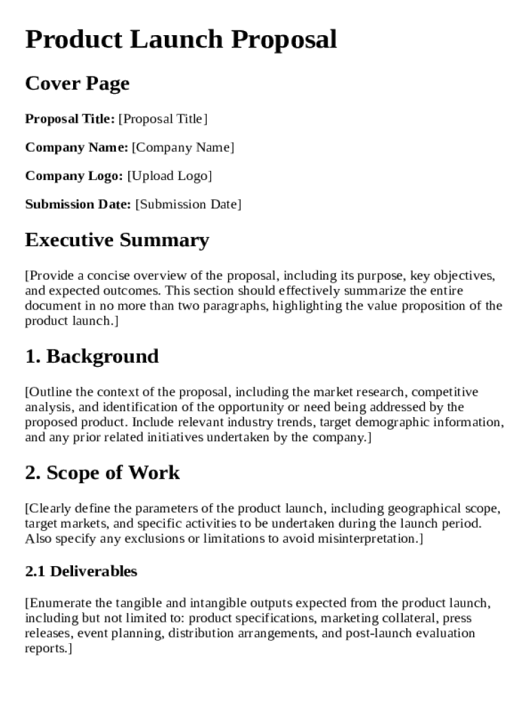 An executive summary should summarize the proposal’s key objectives. This section explains why the product is being launched and the expected outcomes, making it a vital part of your proposal.