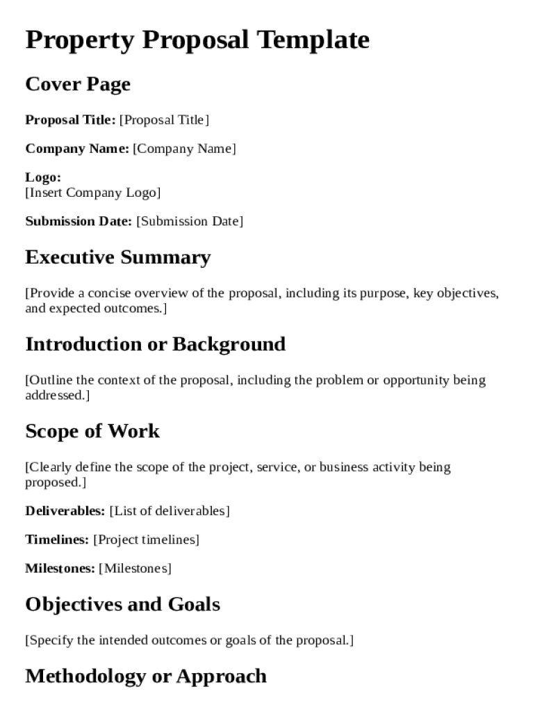 This document serves as a template for creating a property proposal, outlining its purpose, scope, objectives, budget, and terms.
