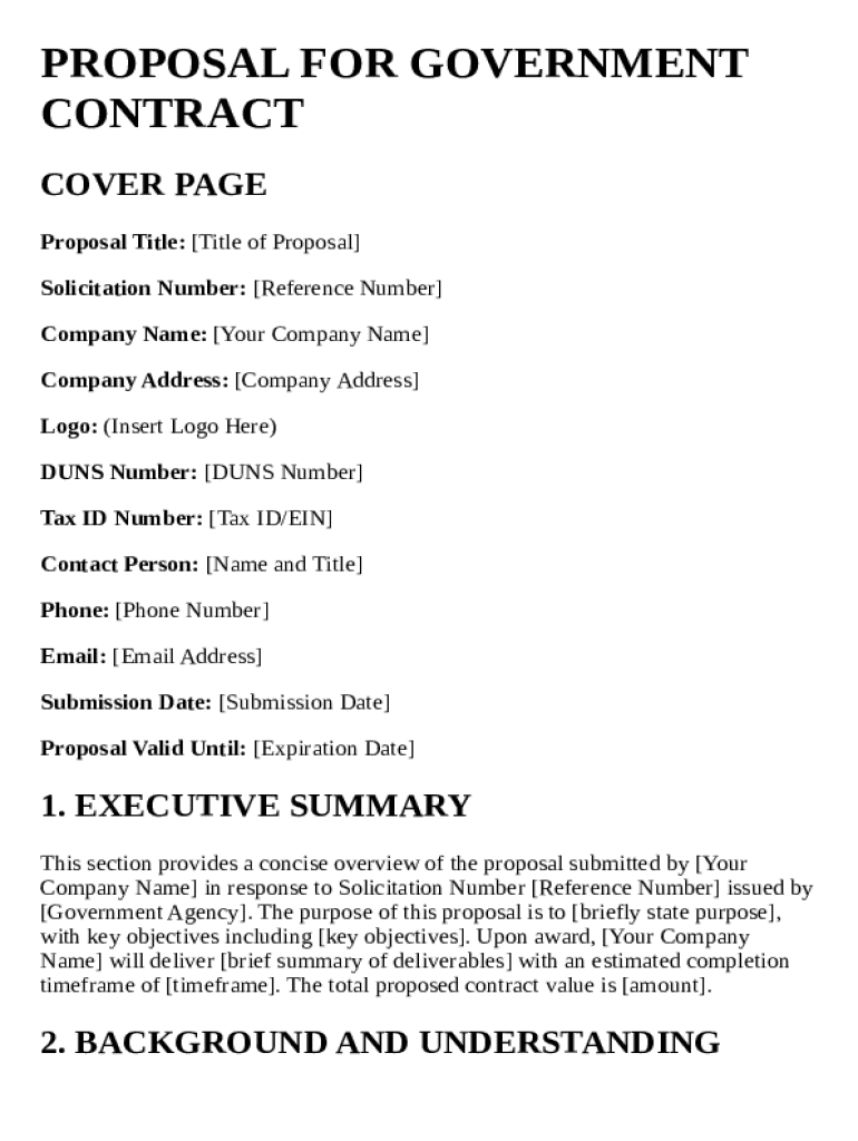 A proposal for a government contract is a formal document submitted by businesses to bid on government projects, outlining how they plan to deliver the requested services or products.