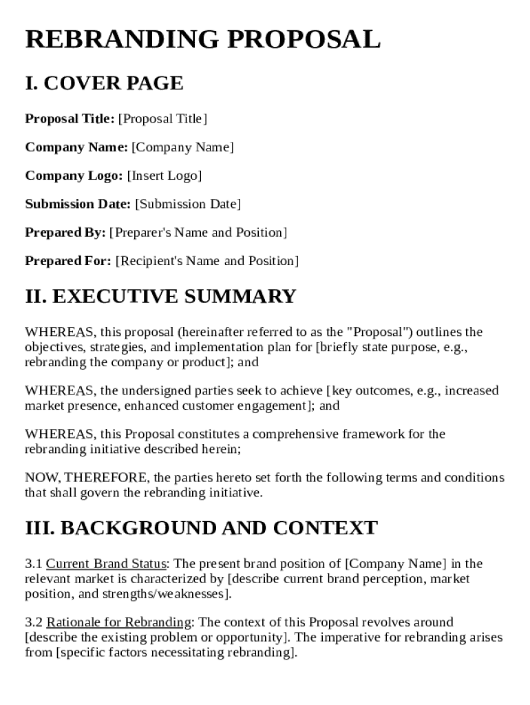 A Rebranding Proposal Template is a structured document designed to outline the plans and strategies for a company's rebranding efforts. It typically includes objectives, target audience analysis, branding concepts, budget estimates, and timelines. Having a well-crafted Rebranding Proposal Template is crucial as it effectively communicates the vision and rationale behind the rebranding to stakeholders, ensuring alignment and support.