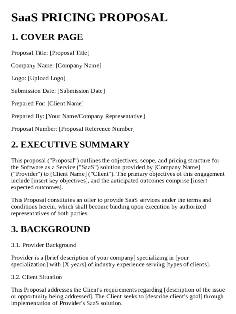 A Saas Pricing Proposal Template is a pre-formatted document that outlines pricing structures and packages for Software as a Service (SaaS) offerings. It serves as a crucial tool for businesses looking to communicate their pricing strategy effectively. Utilizing a well-designed Saas Pricing Proposal Template can help streamline the sales process and ensure transparency with potential clients.