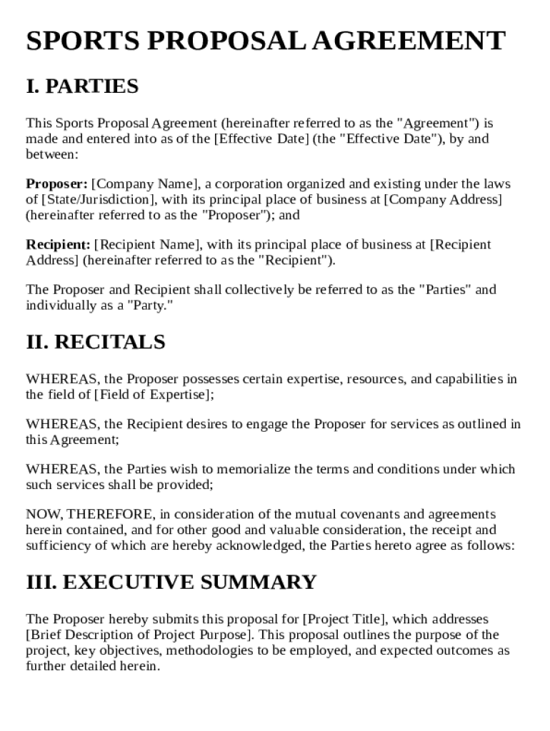 A Sports Proposal Template is a structured document designed to help individuals and teams present their ideas, plans, and requests related to sports initiatives. This template outlines key components such as objectives, budgets, and expected outcomes. By using a Sports Proposal Template, users can ensure their proposals are clear, professional, and effectively communicate their vision.