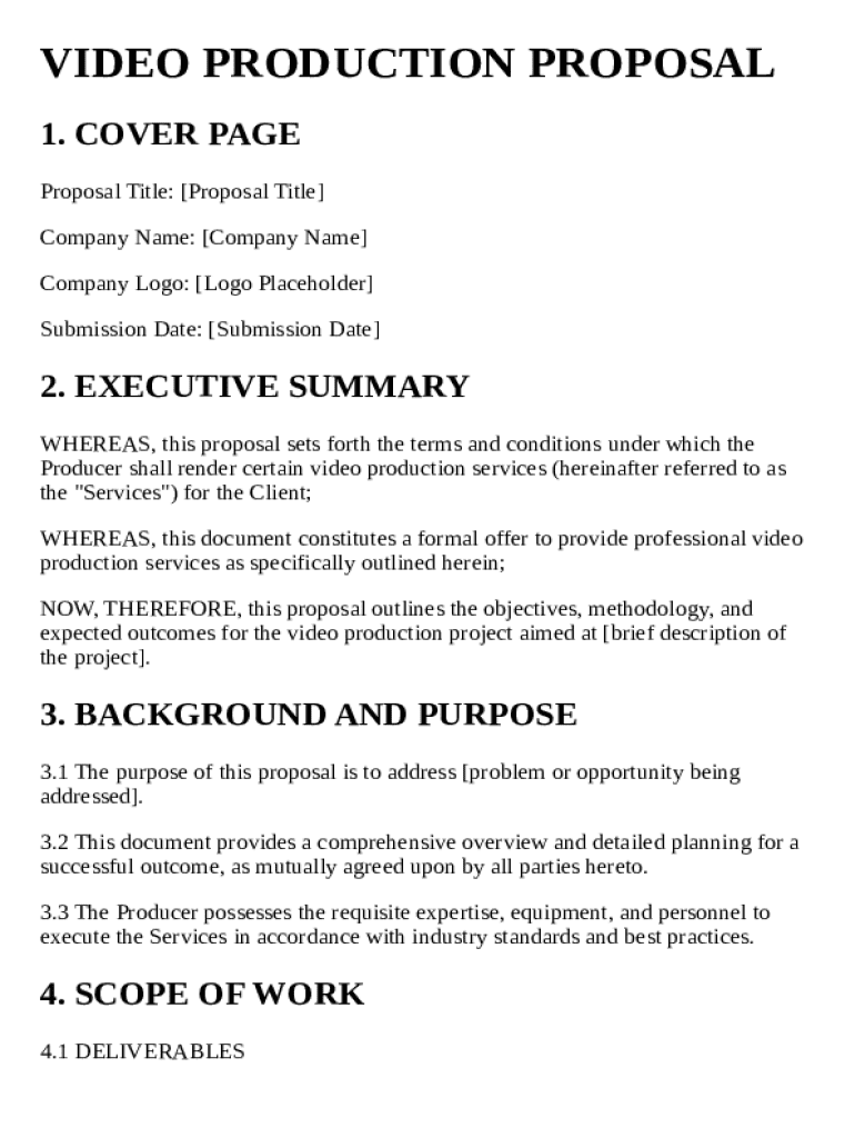 This document serves as a formal proposal for video production services, outlining terms, objectives, methodology, deliverables, and financial considerations.