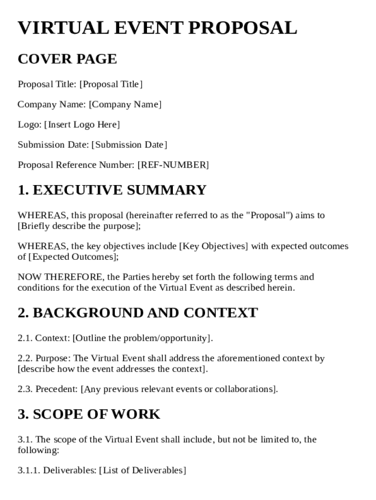 This document serves as a proposal for executing a virtual event, outlining objectives, scope of work, methodology, budget, and terms and conditions.