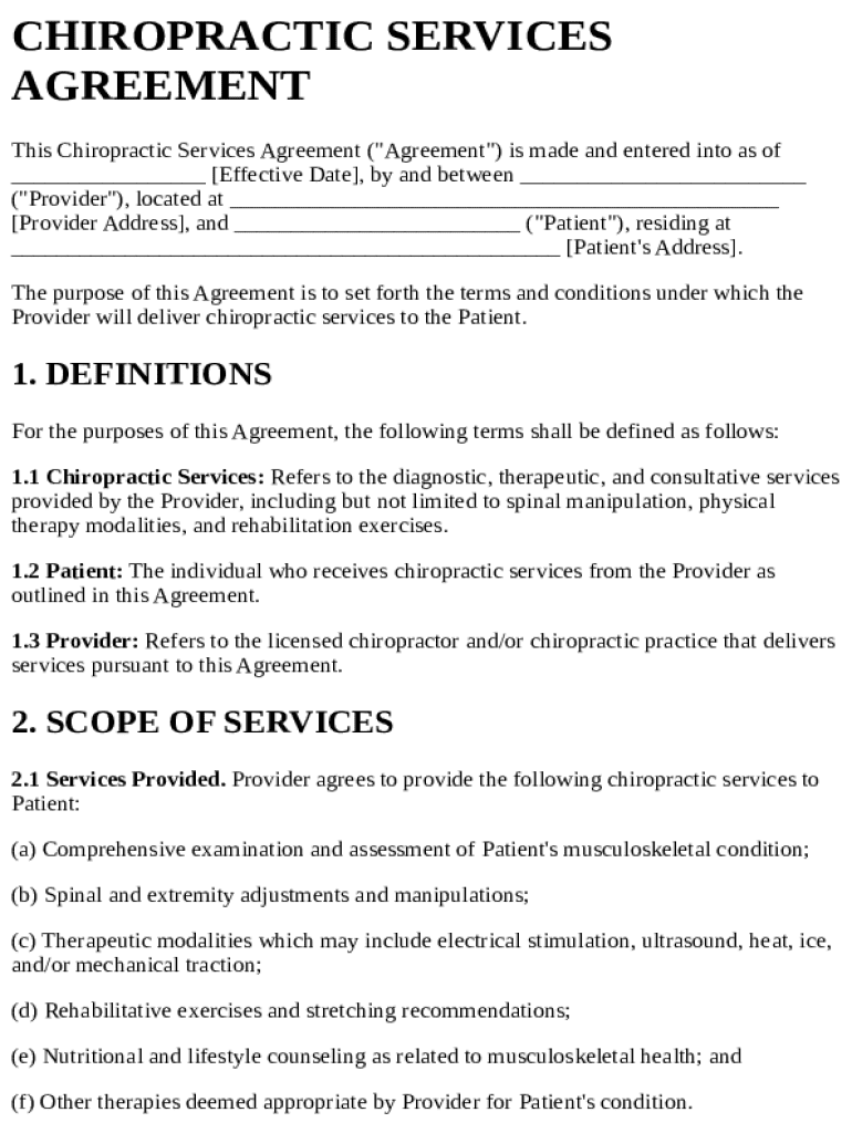 A chiropractic services agreement is a legal document outlining the terms and conditions of chiropractic care between a provider and a patient.