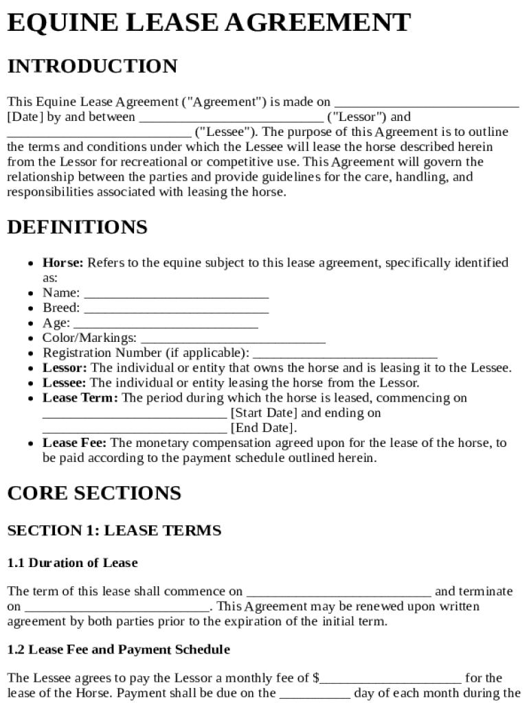 An equine lease agreement is a legal document that outlines the terms under which a horse is leased between a lessor (the horse owner) and a lessee (the person leasing the horse). This agreement serves to protect both parties and details important aspects such as care, responsibilities, and liabilities.