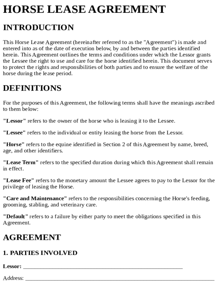 This document outlines the terms and conditions under which a horse is leased from the lessor to the lessee, detailing the responsibilities, rights, lease fee, and termination conditions.