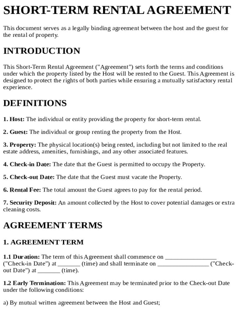 A short-term rental agreement is a legally binding document outlining the terms and conditions of a rental for a temporary period, typically less than 30 days. These agreements are essential for both hosts and guests to define expectations and protect their rights.